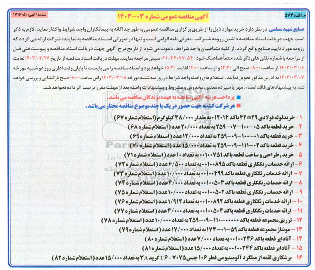 صنایع شهید مسلمی در نظر دارد خرید موارد ذیل را از طریق برگزاری مناقصه عمومی به طور جداگانه به پیمانکاران واجد شرایط واگذار نماید. لازم به ذکر است جهت دریافت اسناد مناقصه داشتن رزومه شرکت ، معرفی نامه الزامی است و تنها در صورتی اسناد مناقصه به نماینده شرکت ارائه میگردد که رزومه مورد تایید صنایع واقع گردد. از کلیه متقاضیان واجد شرایط ، دعوت میشود از تاریخ درج آگهی جهت دریافت اسناد مناقصه و پیوست فنی قبل از مراجعه با شماره تلفن های ذکر شده حتماً هماهنگ شود 36077054-021 سپس مراجعه نمایند مهلت دریافت اسناد مناقصه از تاریخ 1403.2.26 لغایت 1403.3.6 از ساعت ۸:۰۰ صبح الی ۱۲:۳۰ و از ساعت ۱۴:۰۰ لغایت ۱۵:۳۰ خواهد بود و اسناد مناقصه را می بایست تا پایان وقت اداری روز دوشنبه مورخ 1403.3.7 به آدرس مذکور تحویل نمایند. استعلام های واصله واجد شرایط در روز سه شنبه مورخ 1403.3.8 راس ساعت ۸:۰۰ صبح بازگشایی و بررسی خواهد شد به پیشنهادهای فاقد امضاء ، مهر یا سپرده معتبر ، مخدوش و مشروط و پیشنهادات واصله بعد از مهلت مقرر ترتیب اثر داده نخواهد شد.