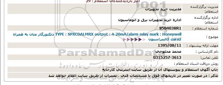موضوع : TYPE : SPXCDALMRX output : 4-20mA/alarm relay mark : Honeywell دتكتورگاز متان به همراه كلاهک كالیبراسیون مهلت ارائه پیشنهاد : 1395.08.11