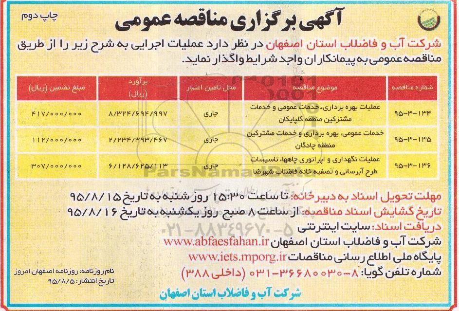 شرکت آب و فاضلاب استان اصفهان در نظر دارد عملیات اجرایی به شرح زیر را از طریق مناقصه عمومی به پیمانکاران واجد شرایط واگذار نماید.