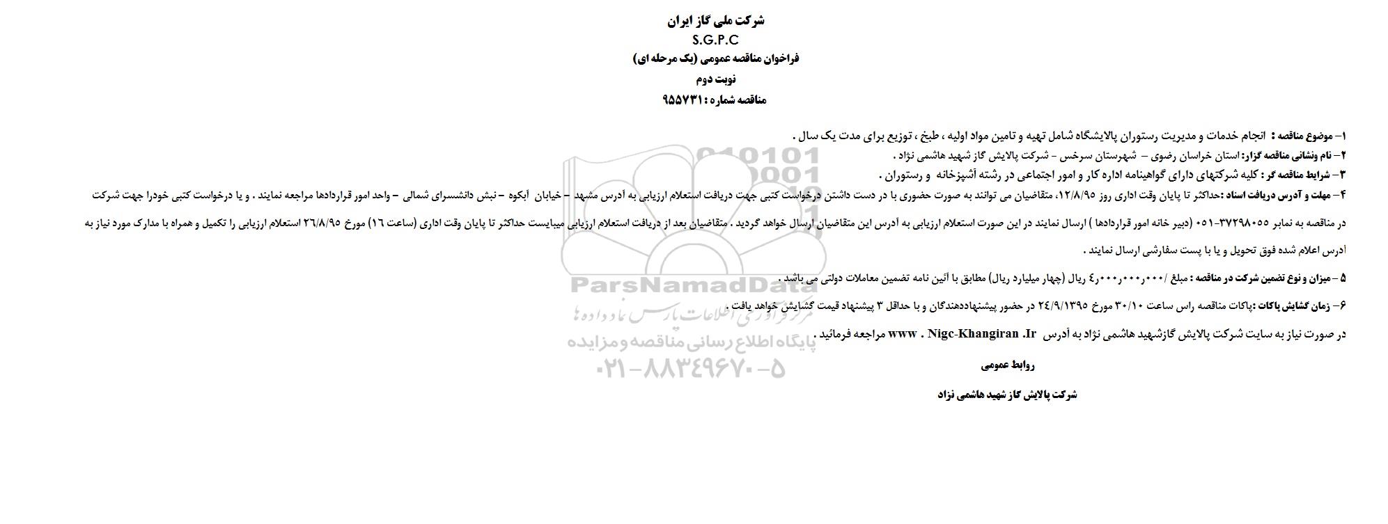 نام و نشانی مناقصه گزار: استان خراسان رضوی، شهرستان سرخس، شرکت پالایش گاز شهید هاشمی نژاد