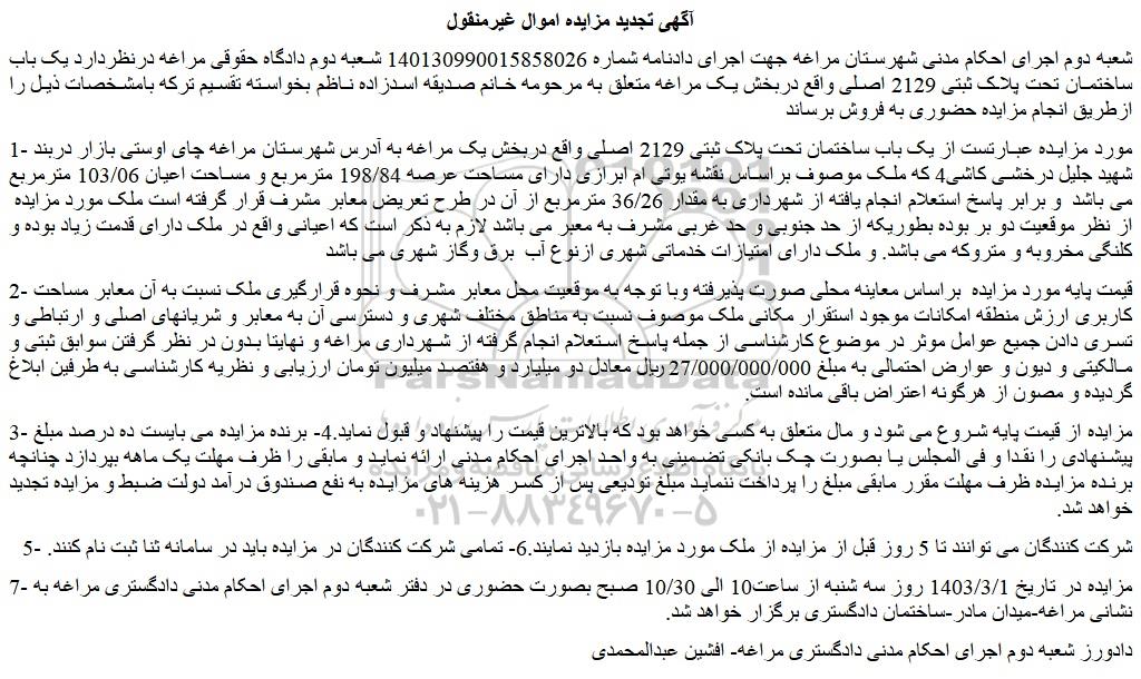 شعبه دوم اجرای احکام مدنی شهرستان مراغه جهت اجرای دادنامه شماره 140130990015858026 شعبه دوم دادگاه حقوقی مراغه درنظردارد یک باب ساختمان تحت پلاک ثبتی 2129 اصلی واقع دربخش یک مراغه متعلق به مرحومه خانم صدیقه اسدزاده ناظم بخواسته تقسیم ترکه بامشخصات ذیل را ازطریق انجام مزایده حضوری به فروش برساند