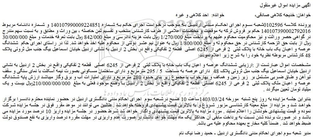 پرونده کلاسه 0102596شعبه سوم اجرای احکام مدنی اردبیل به موجب درخواست اجرای حکم به شماره 140107990009224851 و شماره دادنامه مربوط 140107390002792016 حکم بر فروش ترکه به موقعیت و مختصات اعلامی از طرف کارشناس منتخب و تقسیم ثمن حاصله ، بین وراث و مطابق و به نسبت سهم مندرج در گواهی حصر وراثت و نیز محکومیت محکوم علیهم به پرداخت مبلغ 1/270/000 ریال بابت هزینه دادرسی و مبلغ 842/000 ریال بابت تعرفه خدمات و مبلغ 30/000/000 ریال از بابت حق الزحمه کارشناس در حق محکوم له و مبلغ 1/800/000 ریال به عنوان نیم عشر دولتی از محکوم علیه اخذ خواهد شد. لذا در راستای اجرای حکم  ششدانگ عرصه و اعیان یک باب خانه با پلاک ثبتی  2 فرعی از 6245 اصلی  قطعه 2 تفکیکی واقع در بخش 2 اردبیل به نشانی اردبیل خیابان اسماعیل بیگ جنب مبل ثروتی پلاک 48 کارشناس مربوطه نظریه خود را به شرح زیر اعلام نمودند: