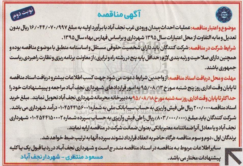موضوع و اعتبار مناقصه : عملیات احداث میدان ورودی غرب نجف آباد با برآورد اولیه به مبلغ 16.044.070.997 ریال بدون تعدیل و مابه التفاوت از محل اعتبارات سال 95 شهرداری براساس فهارس بهاء سال 95