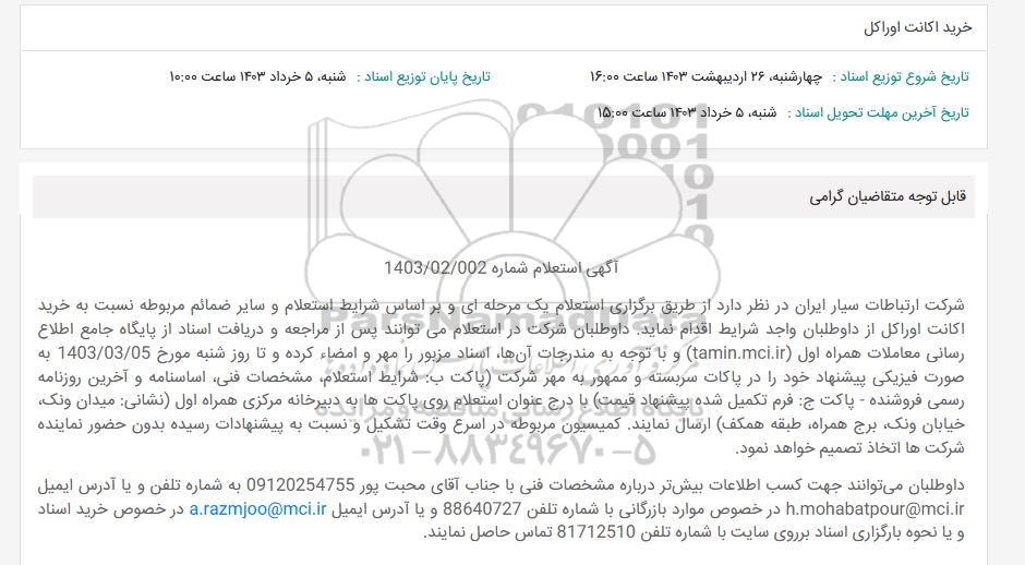 شرکت ارتباطات سیار ایران در نظر دارد از طریق برگزاری استعلام یک مرحله ای و بر اساس شرایط استعلام و سایر ضمائم مربوطه نسبت به خرید اکانت اوراکل از داوطلبان واجد شرایط اقدام نماید. داوطلبان شرکت در استعلام می توانند پس از مراجعه و دریافت اسناد از پایگاه جامع اطلاع رسانی معاملات همراه اول (tamin.mci.ir) و با توجه به مندرجات آنها، اسناد مزبور را مهر و امضاء کرده و تا روز شنبه مورخ 1403.03.05 به صورت فیزیکی پیشنهاد خود را در پاکات سربسته و ممهور به مهر شرکت (پاکت ب: شرایط استعلام، مشخصات فنی، اساسنامه و آخرین روزنامه رسمی فروشنده - پاکت ج: فرم تکمیل شده پیشنهاد قیمت) با درج عنوان استعلام روی پاکت ها به دبیرخانه مرکزی همراه اول (نشانی: میدان ونک، خیابان ونک، برج همراه، طبقه همکف) ارسال نمایند. کمیسیون مربوطه در اسرع وقت تشکیل و نسبت به پیشنهادات رسیده بدون حضور نماینده شرکت ها اتخاذ تصمیم خواهد نمود.
