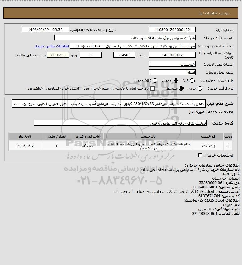 شرح کلی نیاز: تعمیر یک دستگاه ترانسفورماتور 230/132/33 کیلوولت (ترانسفورماتور آسیب دیده پست اهواز جنوبی ) طبق شرح پیوست .