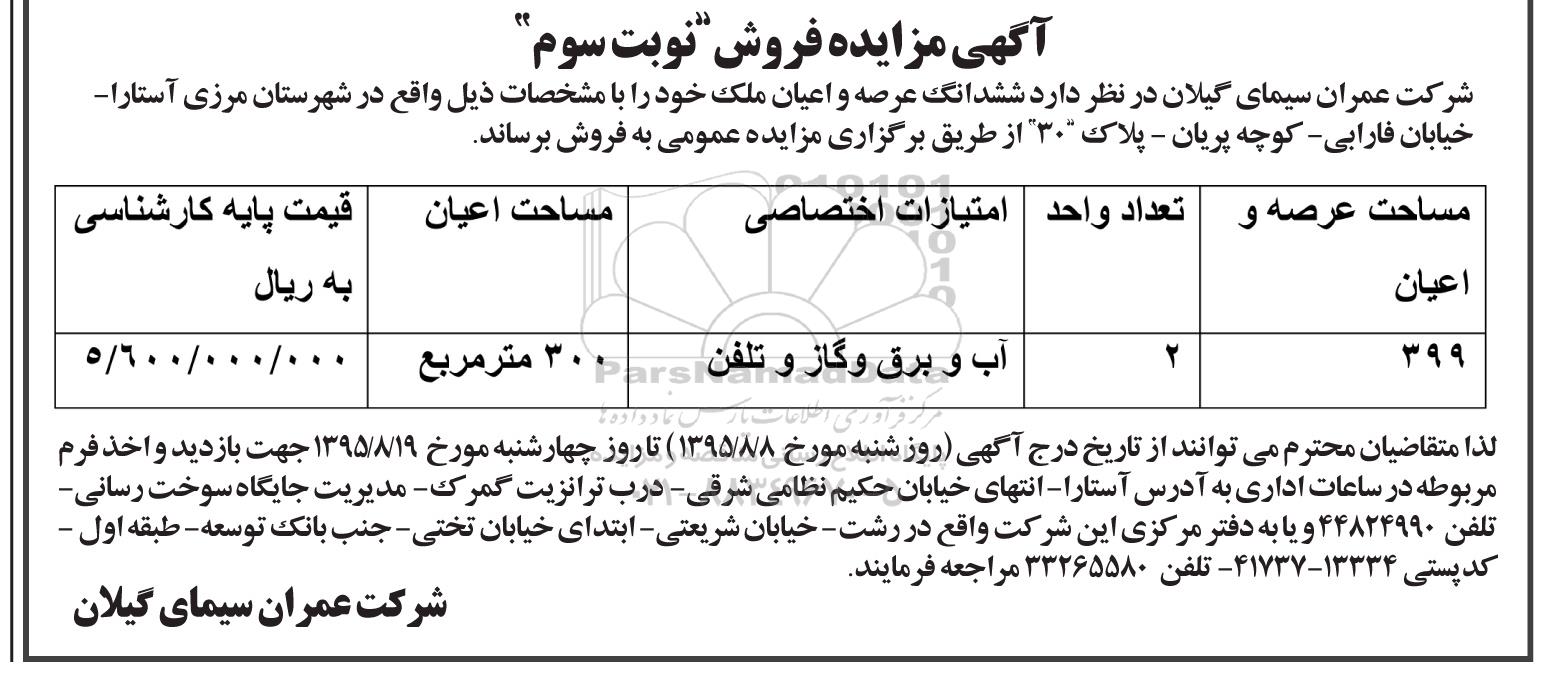 مزایده عمومی مزایده فروش ششدانگ عرصه و اعیان ملک با مساحت 399متر نوبت سوم برگزار میگردد. از کلیه افراد متخصص و شرکتهای واجد شرایط دعوت به عمل میآید تا در این مزایده با کد خبرگزاری پارس نماد : 745592 شرکت نمایند تاریخ شروع مزایده : 1395/08/08 مهلت شرکت در مزایده: تا پایان روز 1395/08/19 مکان برگزاری اموال واگذاری استانهای گیلان و دستهبندیهای مربوط به این حراجی املاک و زمین میباشد.