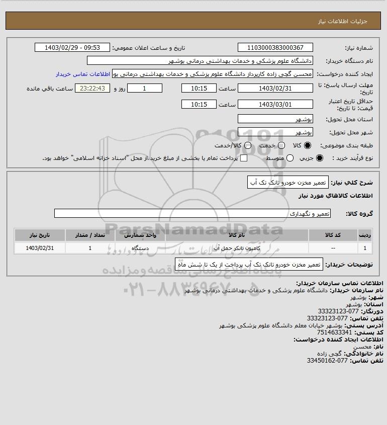 استعلام تعمیر مخزن خودرو تانک تک آب, استعلام تعمیر مخزن خودرو تانک تک آب