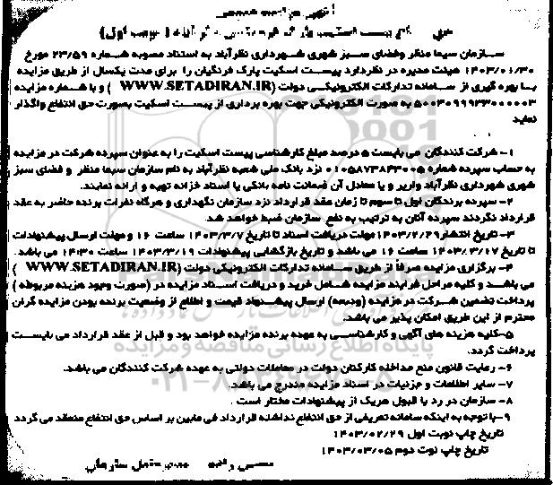 سازمان سیما منظر و فضای سبز شهری شهرداری نظر آباد به استناد مصوبه شماره 23/59 مورخ 1403.1.30 هیئت مدیره در نظر دارد پیست اسکیت پارک فرنگیان را برای مدت یک سال ازطریق مزایده با بهره گیری از سامانه تدارکات الکترونیکی دولت (ستاد ایران) و با شماره مزایده 5003099933000003 به صورت الکترونیکی مورد جهت بهره برداری از پیست اسکیت بصورت حق انتفاع واگذار نماید.