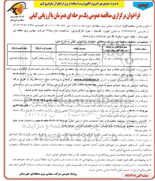 | 3021006/ 03./م | 2003001262000014 | انجام عملیات نگهداری و تعمیرات پست های انتقال و فوق توزیع تحت پوشش شرکت برق منطقه ای خوزستان در سال 1404- 1403 | 2.331.333.459.907 | 55.326.669.198 |