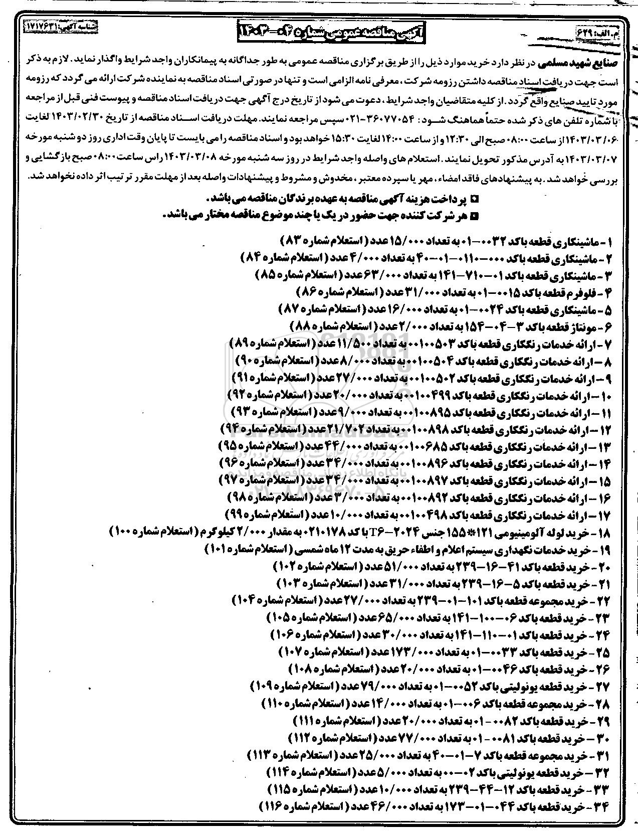 صنایع شهید مسلمی در نظر دارد خرید موارد ذیل را از طریق برگزاری مناقصه عمومی به طور جداگانه به پیمانکاران واجد شرایط واگذار نماید. لازم به ذکر است جهت دریافت اسناد مناقصه داشتن رزومه شرکت معرفی نامه الزامی است و تنها در صورتی اسناد مناقصه به نماینده شرکت ارائه می گردد که رزومه مورد تایید صنایع واقع گردد از کلیه متقاضیان واجد شرایط دعوت میشود از تاریخ درج آگهی جهت دریافت اسناد مناقصه و پیوست فنی قبل از مراجعه با شماره تلفنهای ذکر شده حتما هماهنگ شود 36077054-021 سپس مراجعه نمایند .مهلت دریافت اسناد مناقصه از تاریخ 1403.2.30 لغایت 1403.3.6 از ساعت 8 صبح الی 12:30 و از ساعت 14:00 لغایت 15:30 خواهد بود و اسناد مناقصه را می بایست تا پایان وقت اداری روز دوشنبه مورخه 1403.3.7 به آدرس مذکور تحویل نمایند. استعلام های واصله واجد شرایط در روز سه شنبه مورخه 1403.3.8 راس ساعت 8:00 صبح بازگشایی و بررسی خواهد شد. به پیشنهادهای فاقد امضاء مهر یا سپرده ،معتبر مخدوش و مشروط و پیشنهادات واصله بعد از مهلت مقرر ترتیب اثر داده نخواهد شد.