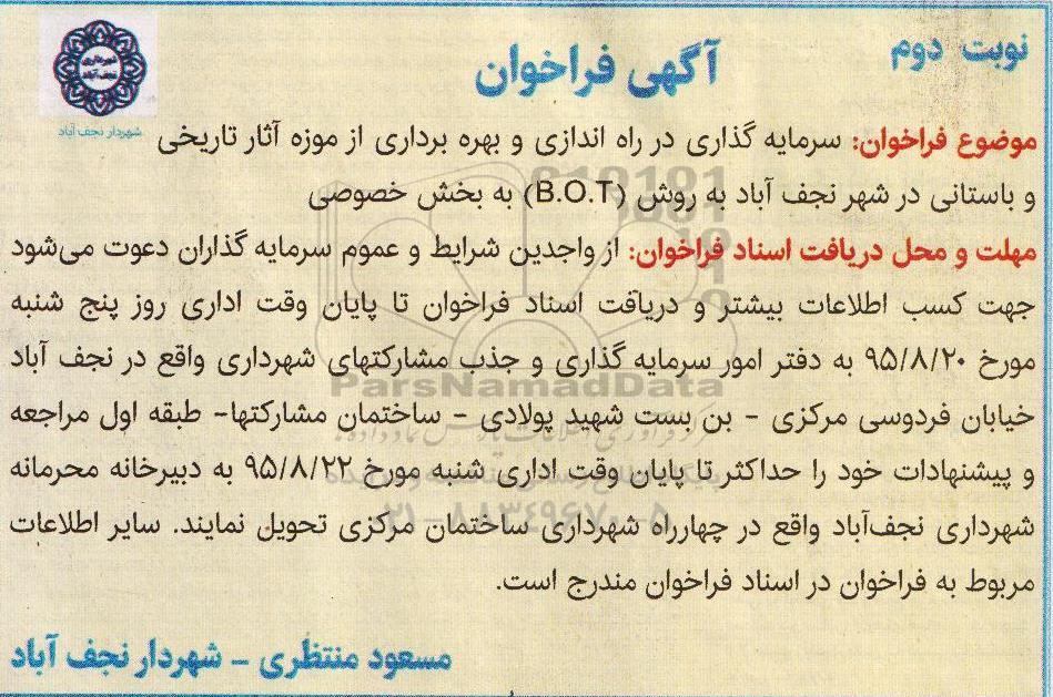 فراخوان سرمایه گذاری در راه اندازی و بهره برداری از موزه آثار تاریخی و باستانی ر شهر نجف آباد نوبت دوم از کلیه افراد متخصص و شرکتها واجد شرایط دعوت به عمل میآید در مناقصه با کد خبرگزاری پارس نماد: 746344 شرکت نمایند.