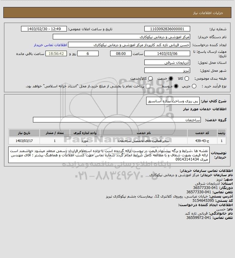 شرح کلی نیاز: پی ریزی وساخت سازه آسانسور