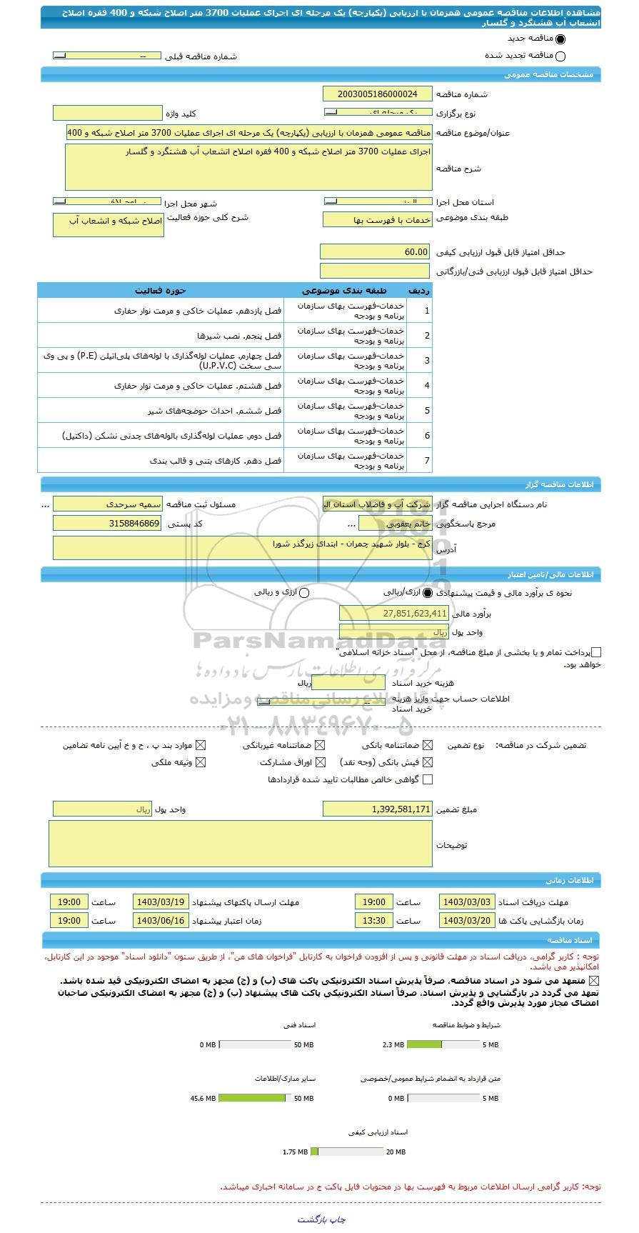 عنوان/موضوع مناقصهمناقصه عمومی همزمان با ارزیابی (یکپارچه) یک مرحله ای اجرای عملیات 3700 متر اصلاح شبکه و 400 فقره اصلاح انشعاب آب هشتگرد و گلسار
