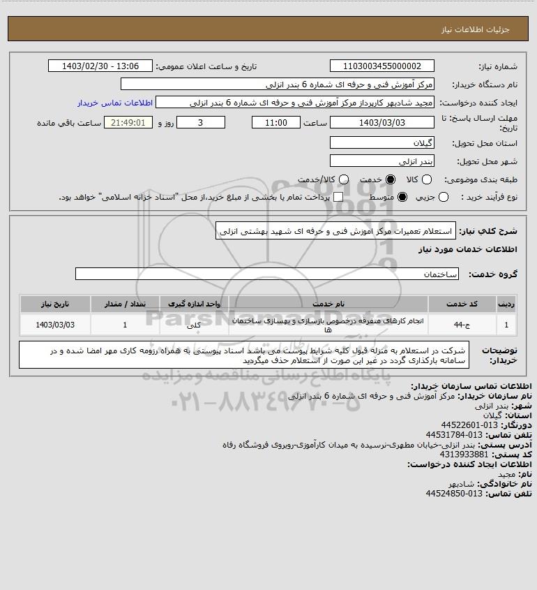 شرح کلی نیاز: استعلام تعمیرات مرکز اموزش فنی و حرفه ای شهید بهشتی انزلی