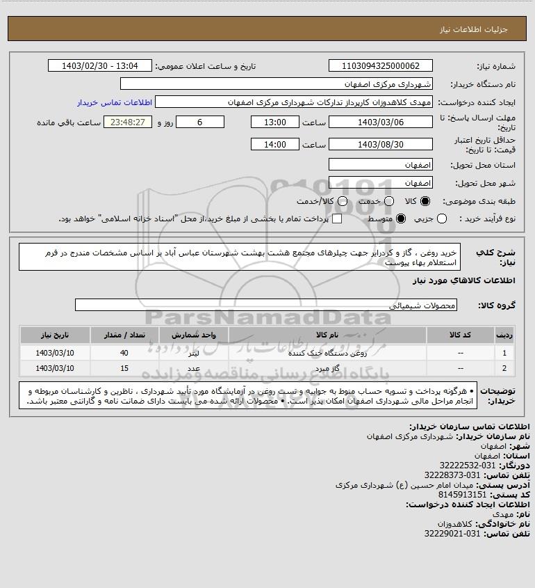 شرح کلی نیاز: خرید روغن ، گاز و کردرایر جهت چیلرهای مجتمع هشت بهشت شهرستان عباس آباد بر اساس مشخصات مندرج در فرم استعلام بهاء پیوست