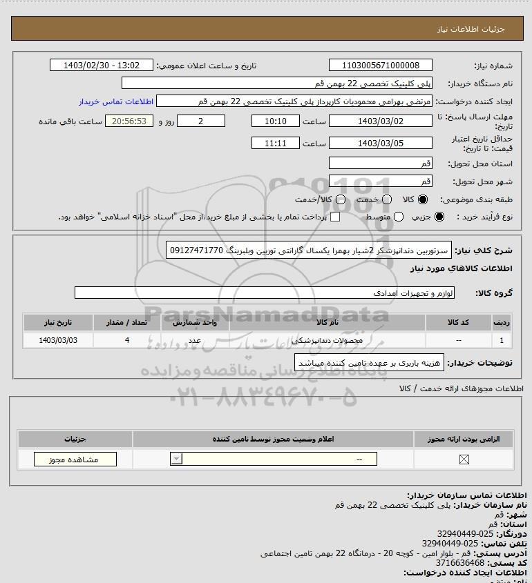 | 1 | -- | محصولات دندانپزشکی | عدد | 4 | 1403/03/03 |