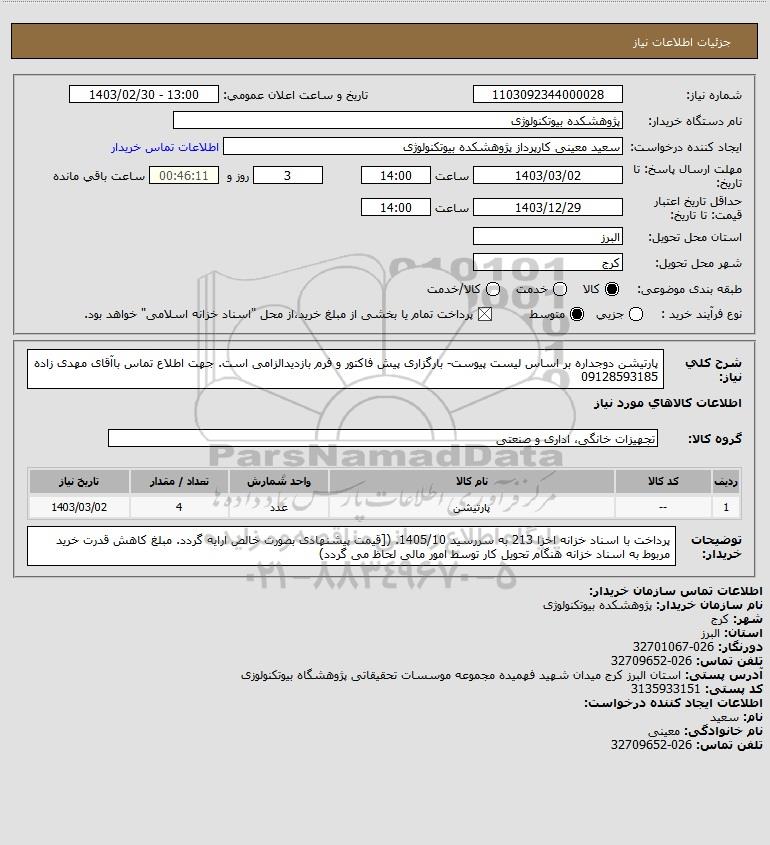 شرح کلی نیاز: پارتیشن دوجداره بر اساس لیست پیوست- بارگزاری پیش فاکتور و فرم بازدیدالزامی است. جهت اطلاع تماس باآقای مهدی زاده 09128593185