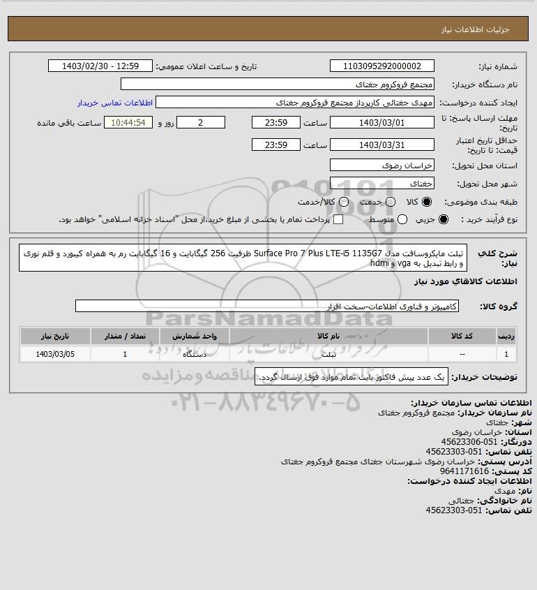 استعلام بها و موضوع استعلام استعلام تبلت مایکروسافت مدل Surface Pro 7 Plus LTE-i5 1135G7 ظرفیت 256 گیگابایت و 16 گیگابایت رم به همراه کیبورد و قلم نوری و رابط تبدیل به vga و hdmi به اطلاع کلیه شرکت‌ها و افراد متخصص واجد شرایط می‌رساند، آگهی گذار در نظر دارد از طریق استعلام بها، نسبت به انتخاب و دریافت پیشنهادات اقدام نماید. این استعلام با کد آگهی ثبت شده در سامانه خبرگزاری پارس نماد : 7463774 منتشر شده است. مشخصات استعلام : تاریخ شروع استعلام: 1403/02/30 آخرین مهلت ارسال پیشنهاد قیمت : 1403/03/01 و محل اجرای پروژه : استان خراسان رضوی میباشد. استعلام قیمت مورد درخواست : استعلام تبلت مایکروسافت مدل Surface Pro 7 Plus LTE-i5 1135G7 ظرفیت 256 گیگابایت و 16 گیگابایت رم به همراه کیبورد و قلم نوری و رابط تبدیل به vga و hdmi با دسته‌بندی‌های تخصصی و گروه های مرتبط : کامپیوتر, تجهیزات مخابرات, استعلام اطلاع رسانی میگردد.