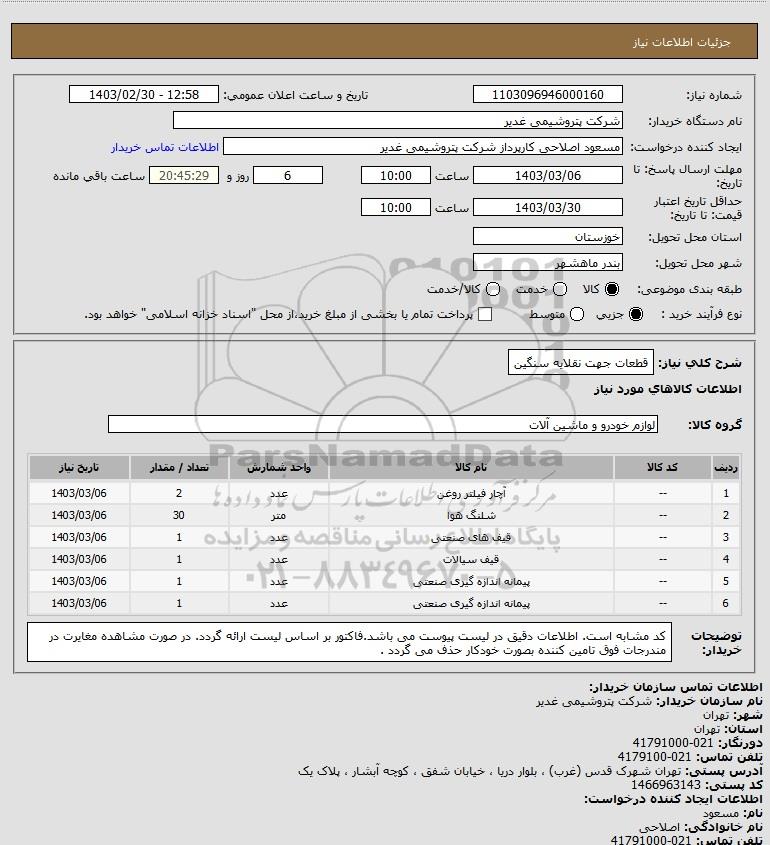 استعلام قطعات جهت نقلایه سنگین, استعلام قطعات جهت نقلایه سنگین