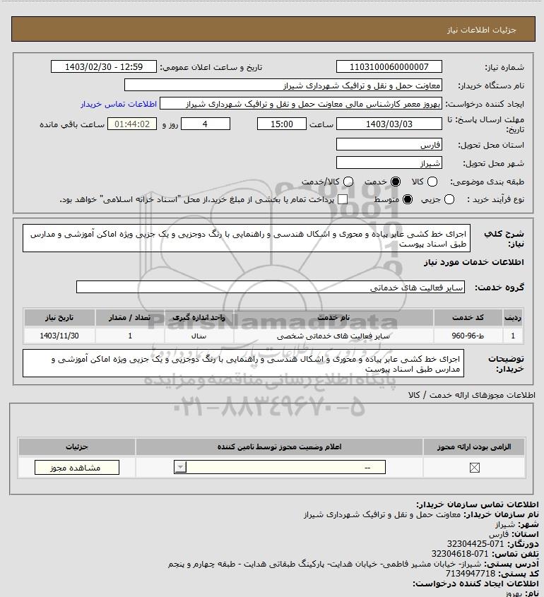 شرح کلی نیاز: اجرای خط کشی عابر پیاده و محوری و اشکال هندسی و راهنمایی با رنگ دوجزیی و یک جزیی ویژه اماکن آموزشی و مدارس طبق اسناد پیوست