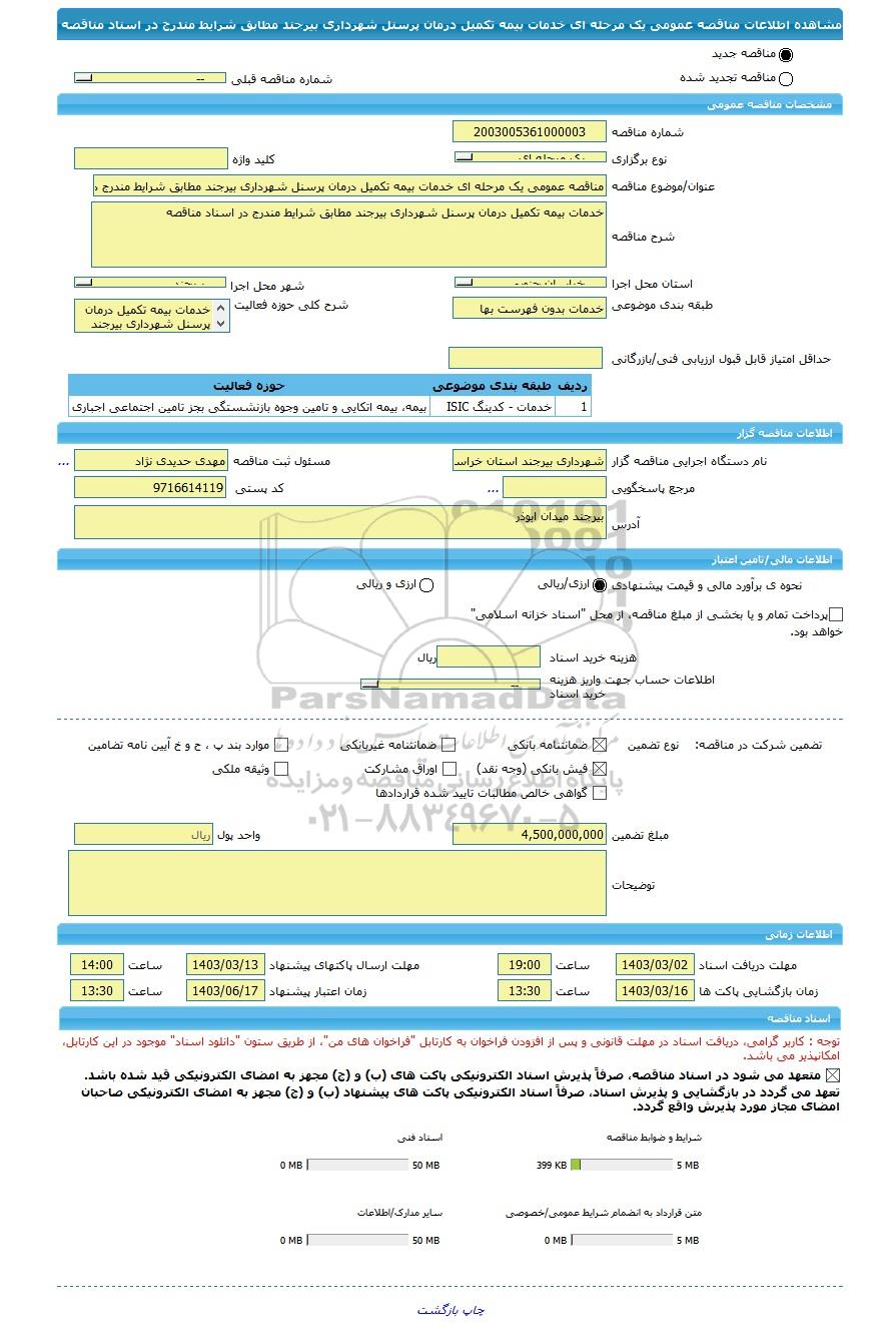 مناقصه، مناقصه عمومی یک مرحله ای خدمات بیمه تکمیل درمان پرسنل شهرداری بیرجند مطابق شرایط مندرج در اسناد مناقصه, مناقصه، مناقصه عمومی یک مرحله ای خدمات بیمه تکمیل درمان پرسنل شهرداری بیرجند مطابق شرایط مندرج در اسناد مناقصه