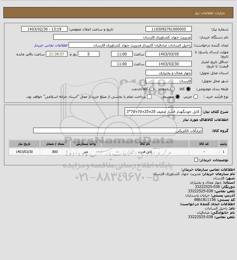 شرح کلی نیاز: کابل خودنگهدار فشار ضعیف 25+25+70+70*3
