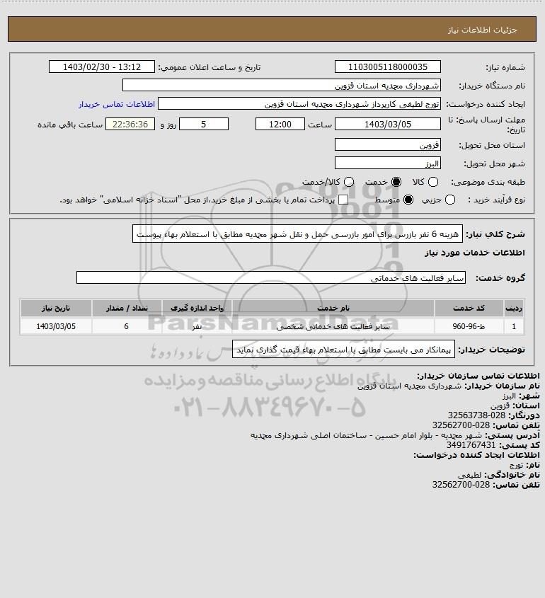 شرح کلی نیاز: هزینه 6 نفر بازرس برای امور بازرسی حمل و نقل شهر محمدیه مطابق با استعلام بهاء پیوست