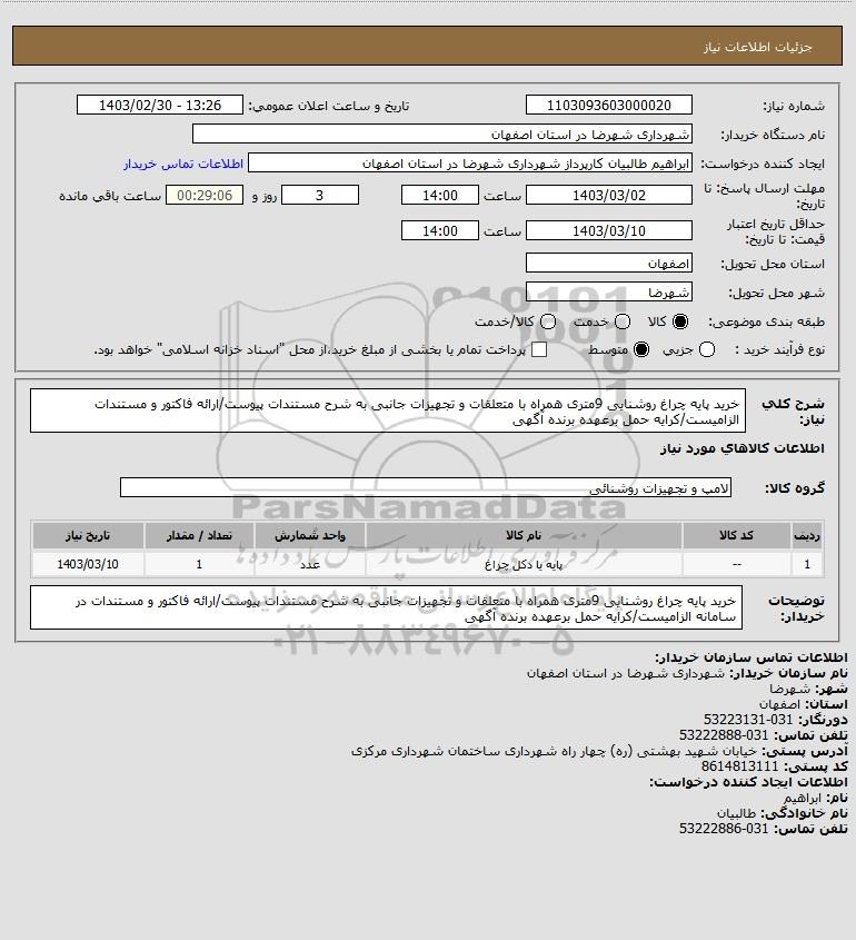 شرح کلی نیاز: خرید پایه چراغ روشنایی 9متری همراه با متعلقات و تجهیزات جانبی به شرح مستندات پیوست/ارائه فاکتور و مستندات الزامیست/کرایه حمل برعهده برنده آگهی