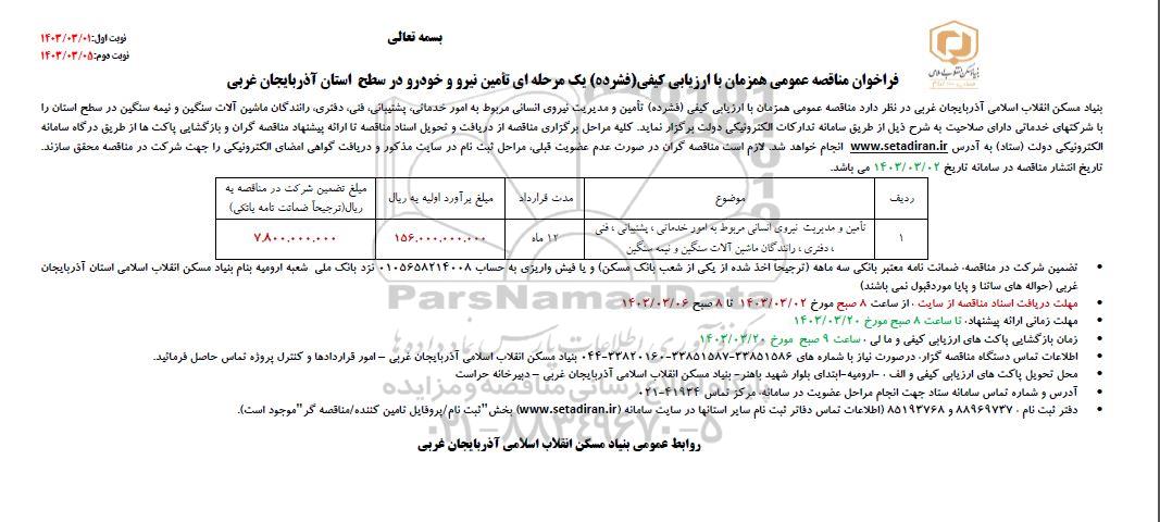 بنیاد مسکن انقلاب اسلامی آذربایجان غربی در نظر دارد مناقصه عمومی همزمان با ارزیابی کیفی (فشرده) تأمین و مدیریت نیروی انسانی مربوط به امور خدماتی پشتیبانی فنی دفتری رانندگان ماشین آلات سنگین و نیمه سنگین در سطح استان را با شرکتهای خدماتی دارای صلاحیت به شرح ذیل از طریق سامانه تدارکات الکترونیکی دولت برگزار نماید. کلیه مراحل برگزاری مناقصه از دریافت و تحویل اسناد مناقصه تا ارائه پیشنهاد مناقصه گران و بازگشایی پاکتها از طریق درگاه سامانه الکترونیکی دولت (ستاد) انجام خواهد شد. لازم است مناقصه گران در صورت عدم عضویت قبلی مراحل ثبت نام در سایت مذکور و دریافت گواهی امضای الکترونیکی را جهت شرکت در مناقصه محقق سازند.تاریخ انتشار مناقصه در سامانه تاریخ 1403.3.2 می باشد.