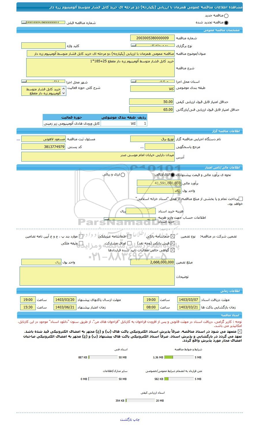 | شرح مناقصه | خرید کابل فشار متوسط آلومینیوم زره دار مقطع 25+185*1 | ||||||||