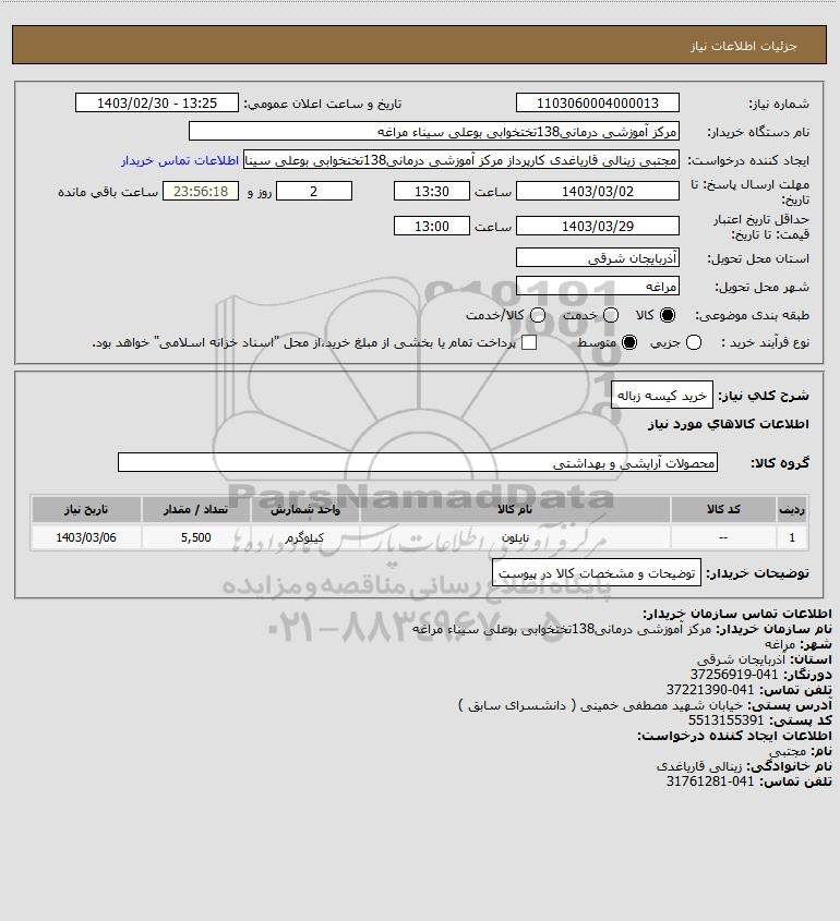 نام دستگاه خریدار:مرکز آموزشی درمانی138تختخوابی بوعلی سیناء مراغه