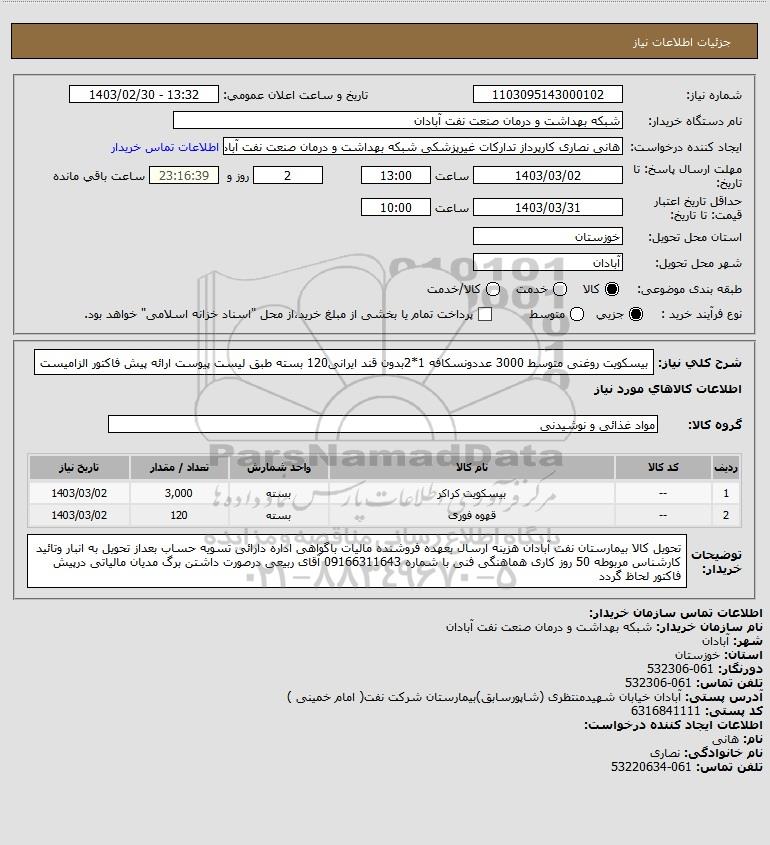 شرح کلی نیاز: بیسکویت روغنی متوسط 3000 عددونسکافه 1*2بدون قند ایرانی120 بسته طبق لیست پیوست ارائه پیش فاکتور الزامیست