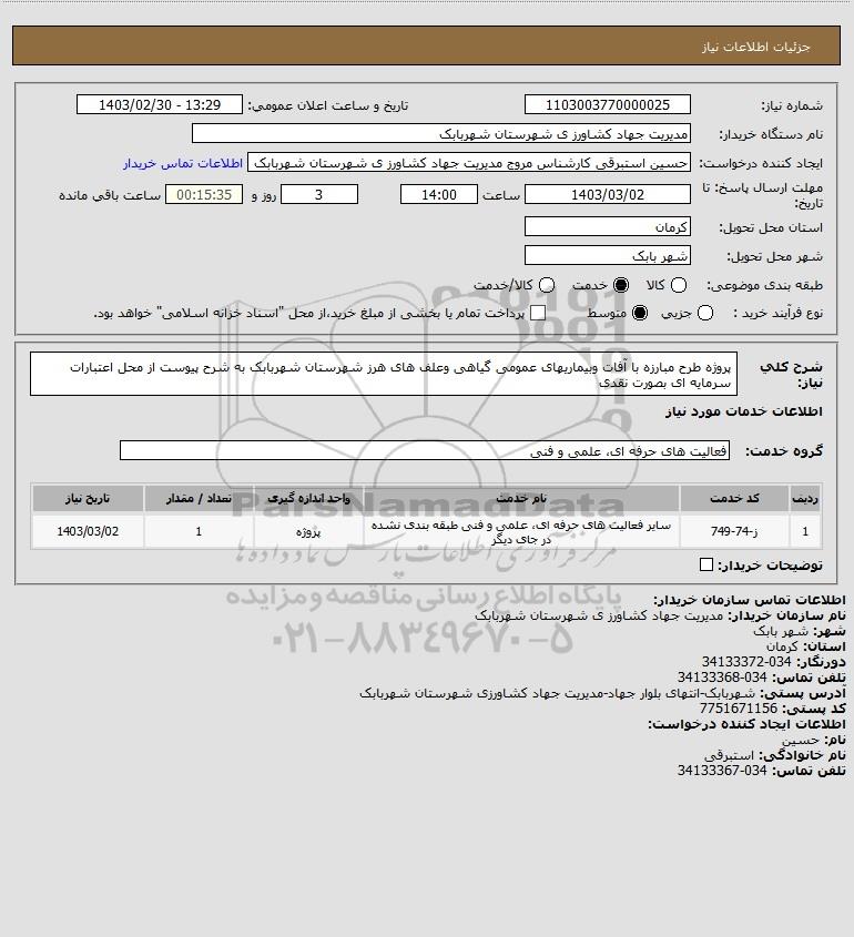 شرح کلی نیاز: پروژه طرح مبارزه با آفات وبیماریهای عمومی گیاهی وعلف های هرز شهرستان شهربابک به شرح پیوست از محل اعتبارات سرمایه ای بصورت نقدی