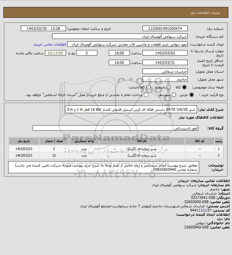 شرح کلی نیاز: شیر ‎GATE VALVE‏ ‎دستی فلکه ای‏ ‎کربن استیل‏ ‎فلنجی‏ فشار ‎16 Bar‏ قطر ‎1 in‏ و ‎3 in‏