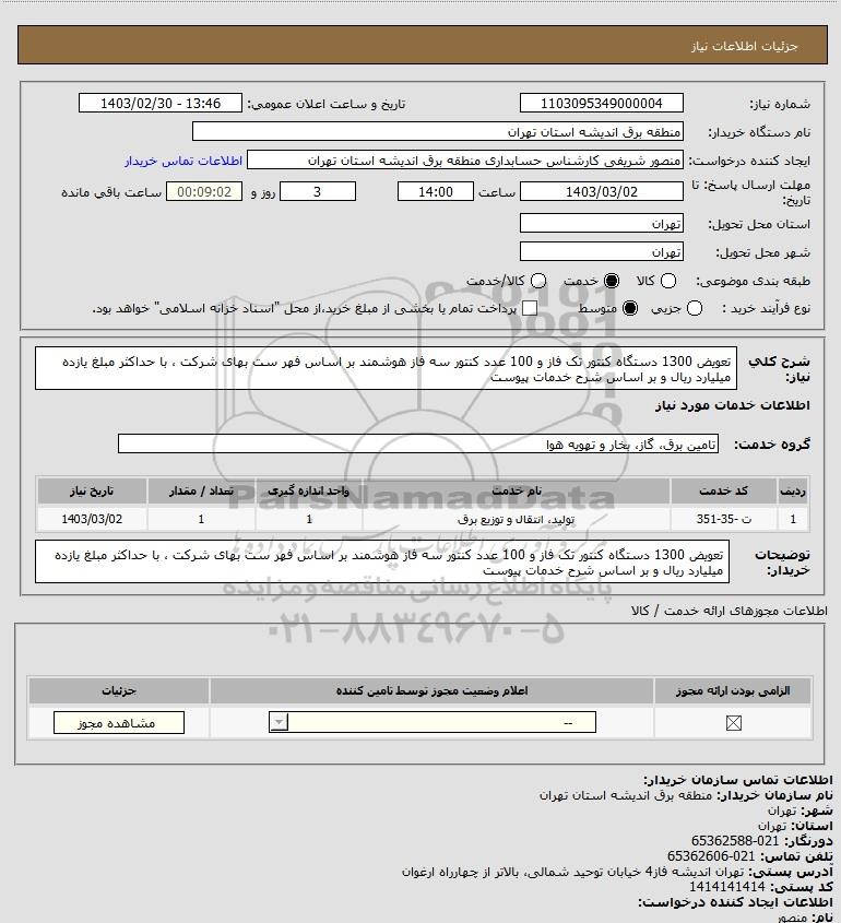 شرح کلی نیاز: تعویض 1300 دستگاه کنتور تک فاز و 100 عدد کنتور سه فاز هوشمند بر اساس فهر ست بهای شرکت ، با حداکثر مبلغ یازده میلیارد ریال و بر اساس شرح خدمات پیوست
