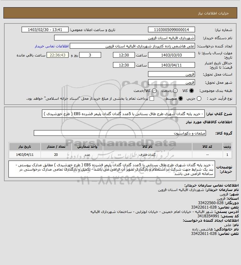 توضیحات خریدار:- خرید پایه گلدان شهری طرح طاق بستانی با 5عدد گلدان گلدان پلیمر فشرده EBS ( طرح خورشیدی ) مطابق مدارک پیوستی - بند یک شرایط جهت شرکت در استعلام و بارگذاری تصویر آن الزامی می باشد - تکمیل و بارگذاری تمامی مدارک درخواستی در سامانه الزامی می باشد