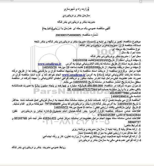 موضوع مناقصه : تعمیر و نگهداری ابنیه و تاسیسات مدیریت بنادر و دریانوردی بندر لنگه و بنادر تابعه دستگاه مناقصه گزار مدیریت بنادر و دریانوردی بندر لنگه
