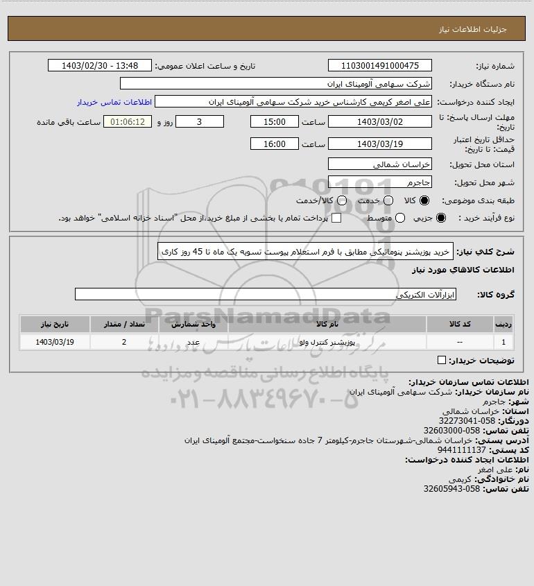 شرح کلی نیاز: خرید پوزیشنر پنوماتیکی مطابق با فرم استعلام پیوست