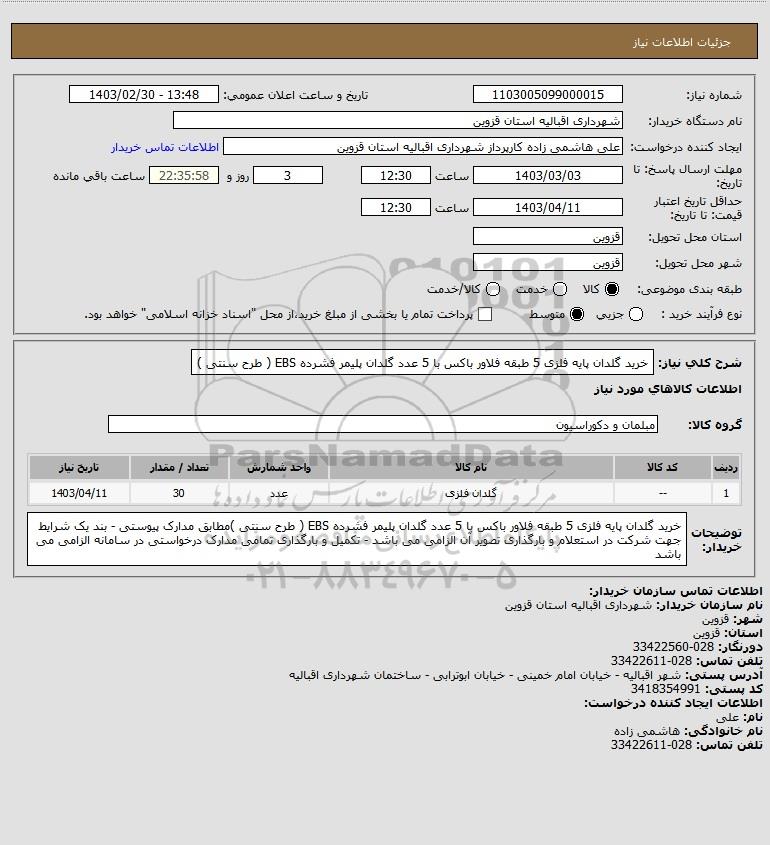 توضیحات خریدار:خرید گلدان پایه فلزی 5 طبقه فلاور باکس با 5 عدد گلدان پلیمر فشرده EBS ( طرح سنتی )مطابق مدارک پیوستی - بند یک شرایط جهت شرکت در استعلام و بارگذاری تصویر آن الزامی می باشد - تکمیل و بارگذاری تمامی مدارک درخواستی در سامانه الزامی می باشد