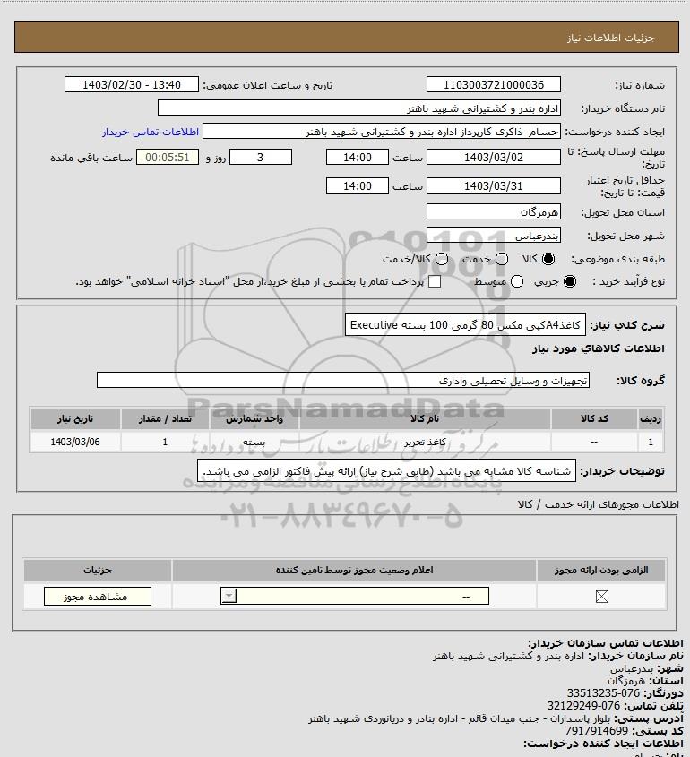 شرح کلی نیاز: کاغذA4کپی مکس 80 گرمی 100 بسته Executive