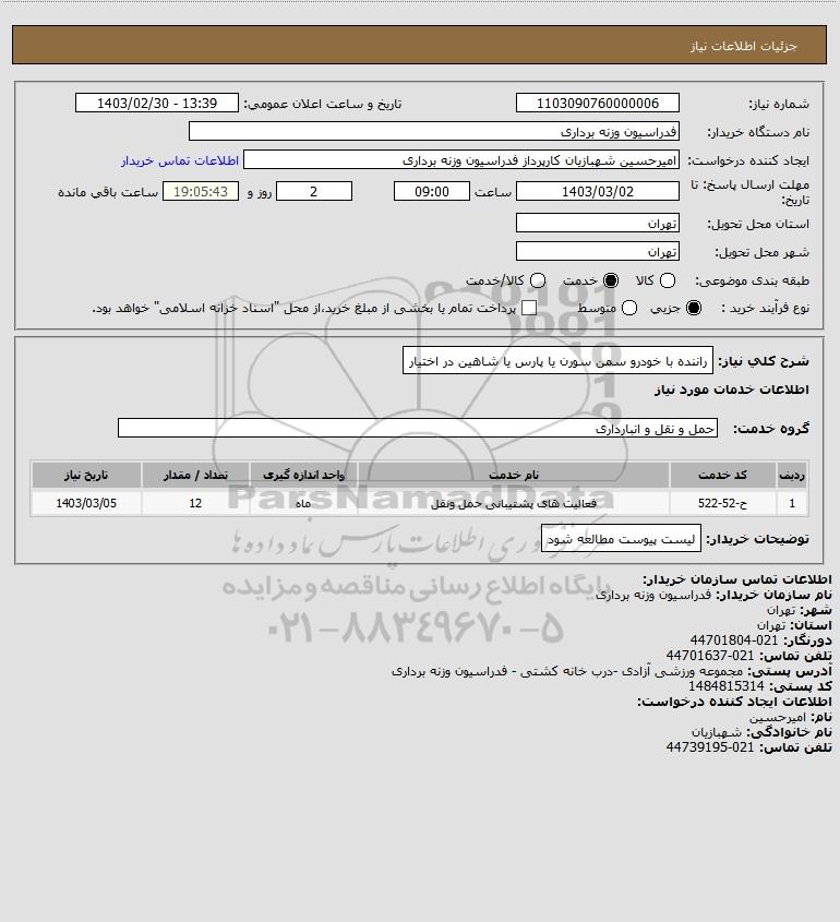 شرح کلی نیاز: راننده با خودرو سمن سورن یا پارس یا شاهین در اختیار