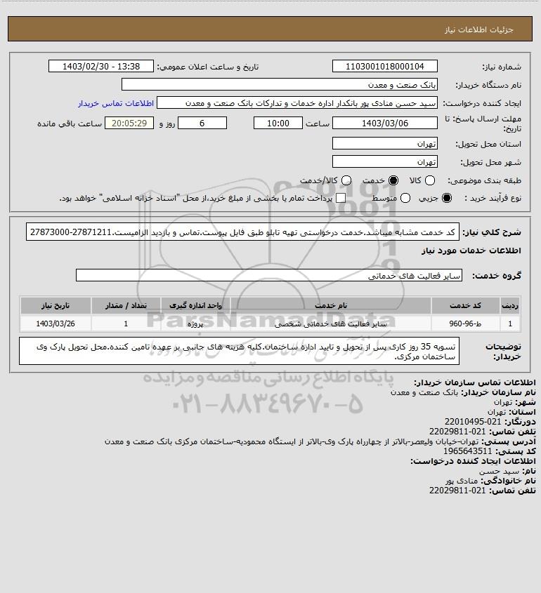استعلام بها و موضوع استعلام استعلام کد خدمت مشابه میباشد.خدمت درخواستی تهیه تابلو طبق فایل پیوست.تماس و بازدید الزامیست.27871211-27873000 به اطلاع کلیه شرکتها و افراد متخصص واجد شرایط میرساند، آگهی گذار در نظر دارد از طریق استعلام بها، نسبت به انتخاب و دریافت پیشنهادات اقدام نماید. این استعلام با کد آگهی ثبت شده در سامانه خبرگزاری پارس نماد : 7464068 منتشر شده است. مشخصات استعلام : تاریخ شروع استعلام: 1403/02/30 آخرین مهلت ارسال پیشنهاد قیمت : 1403/03/06 و محل اجرای پروژه : استان تهران میباشد. استعلام قیمت مورد درخواست : استعلام کد خدمت مشابه میباشد.خدمت درخواستی تهیه تابلو طبق فایل پیوست.تماس و بازدید الزامیست.27871211-27873000 با دستهبندیهای تخصصی و گروه های مرتبط : طراحی چاپ و تبلیغات, تابلوهای محیطی, استعلام اطلاع رسانی میگردد.