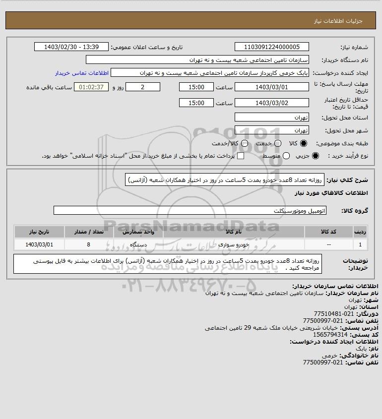 استعلام روزانه تعداد 8عدد خودرو بمدت 5ساعت در روز در اختیار همکاران شعبه (آژانس), استعلام روزانه تعداد 8عدد خودرو بمدت 5ساعت در روز در اختیار همکاران شعبه (آژانس)