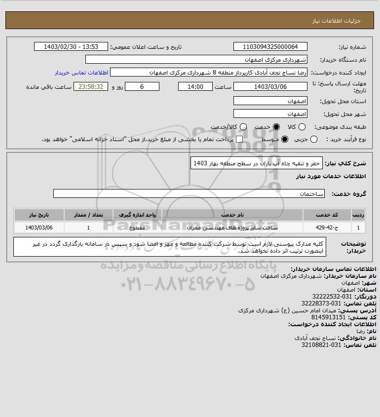 شرح کلی نیاز: حفر و تنقیه چاه آب باران در سطح منطقه بهار 1403