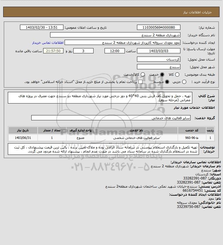 شرح کلی نیاز: تهیه ، حمل و تحویل کف فرش بتنی 40*40 و دور درختی مورد نیاز شهرداری منطقه دو سنندج جهت مصرف در پروژه های عمرانی (مرحله سوم)