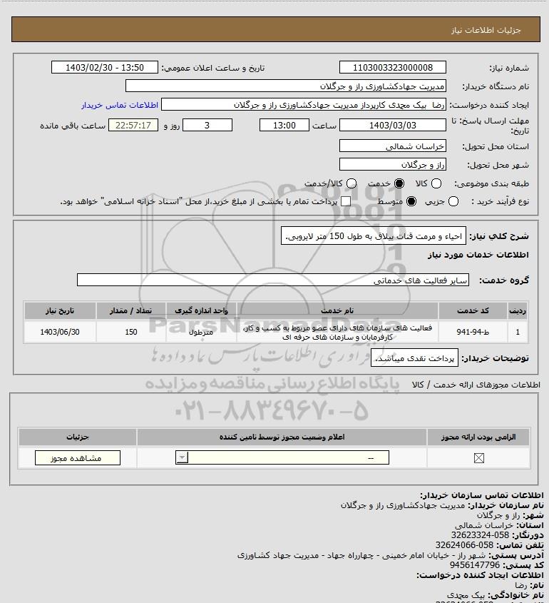 شرح کلی نیاز: احیاء و مرمت قنات ییلاق به طول 150 متر لایروبی.