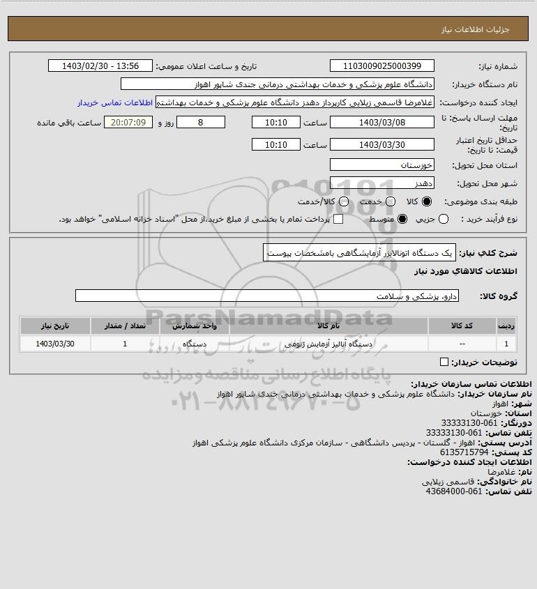 شرح کلی نیاز: یک دستگاه اتونالایزر آزمایشگاهی بامشخصات پیوست
