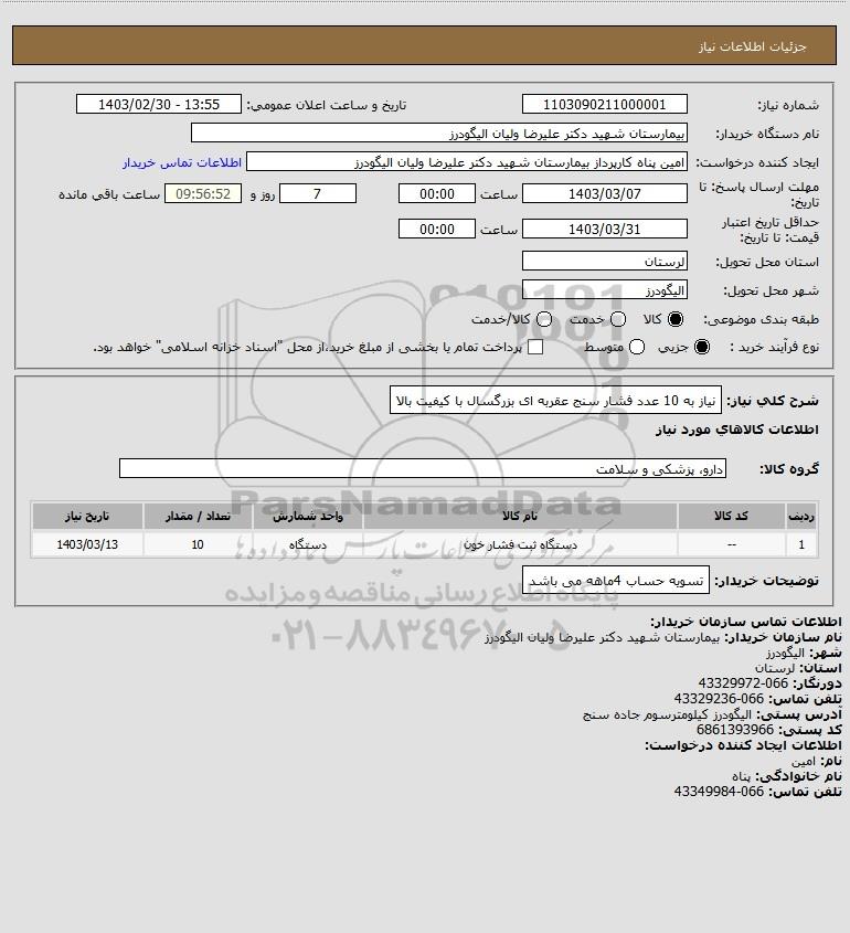 شرح کلی نیاز: نیاز به 10 عدد فشار سنج عقربه ای بزرگسال با کیفیت بالا