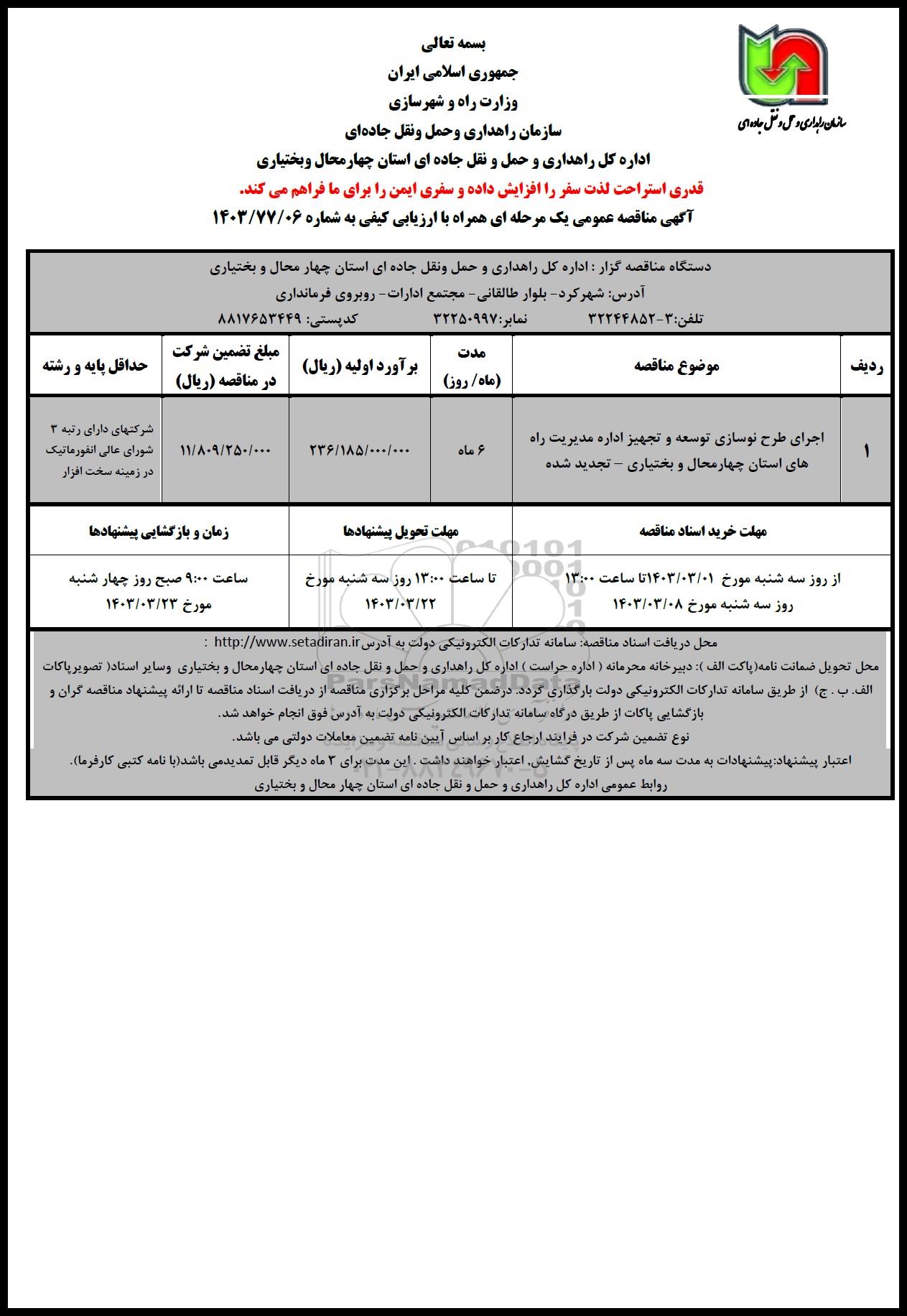 - دستگاه مناقصه گزار: اداره کل راهداری و حمل و نقل جاده ای استان چهارمحال و بختیاری