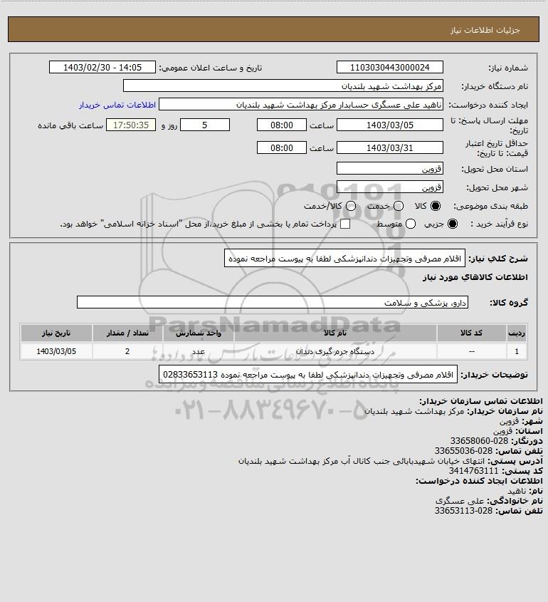 توضیحات خریدار:اقلام مصرفی وتجهیزات دندانپزشکی لطفا به پیوست مراجعه نموده 02833653113